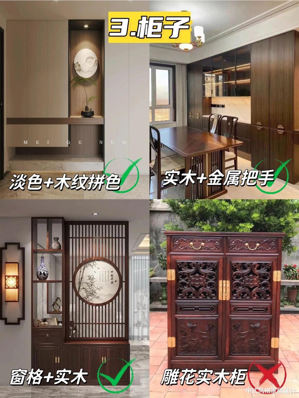 三、柜子:装隐形拉手+留白设计,不装镂空雕花柜新中式的柜体,应是静谧的背景而非喧闹的主体。推荐采用平板柜门搭配内嵌式拉手(如古铜条),线条干净利落。柜体顶部预留30公分左右的空档,既避免了顶天立地的压迫感,视觉上也能拉高层高,使柜体宛若一面装饰墙。务必远离通体镂空雕花的柜子,不仅难以清洁,过于密集的图案也会带来视觉焦虑,破坏了中式美学中“疏可跑马”的意境。