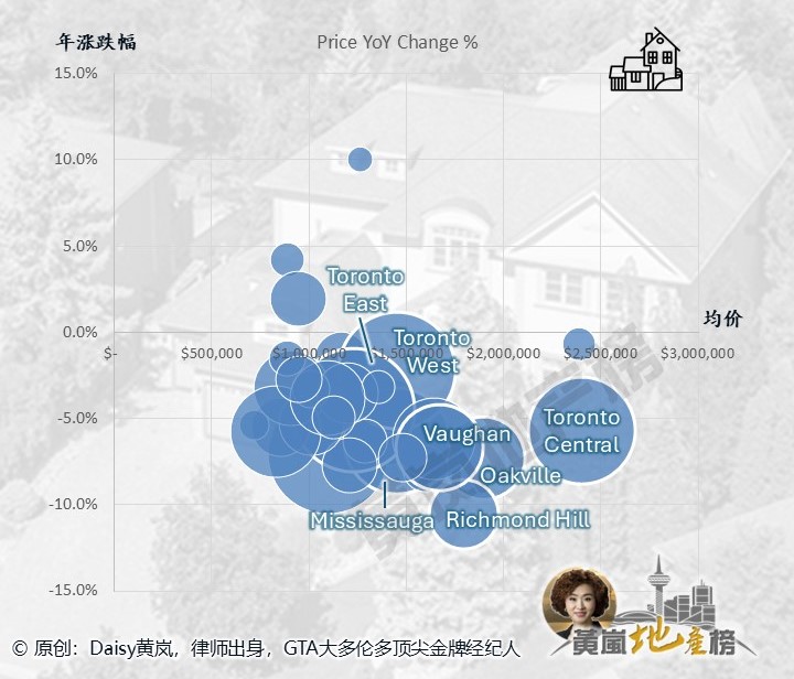 【2025年GTA大多伦多地区独立屋均价及涨跌幅二维矩阵象限图】