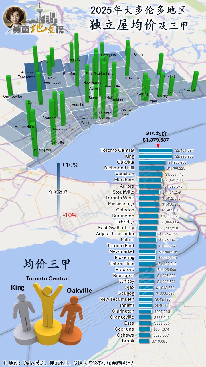 【2025年GTA大多伦多地区独立屋均价排名及涨跌幅热图 】