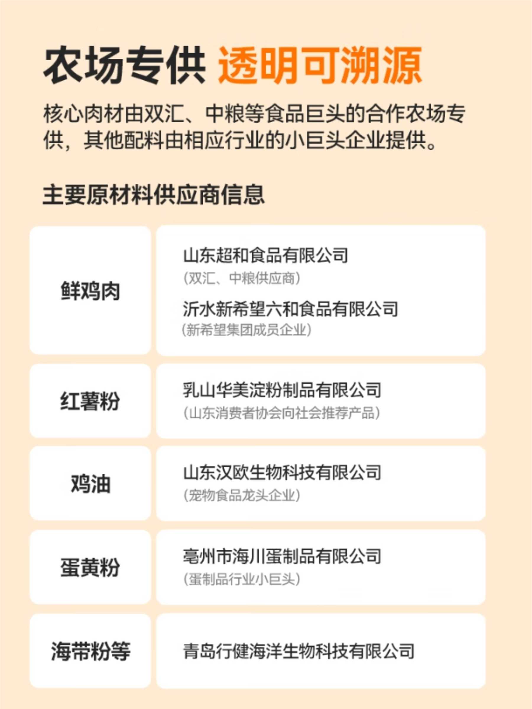 性价比高安全希喂冻干粮,在这方面做得比较透明,直接公开了原料的供应商和物流信息。粮里占比最大的肉类,来自山东两家大型食品企业。这两家企业的名字大家可能不太熟悉,但它们其实长期为双汇、中粮这些国民级品牌供应原料,在品控和规模上有相当的保障。所用的鸡,是在自有养殖场处理加工,随后全程通过冷链运至工厂,尽可能锁住鲜度。