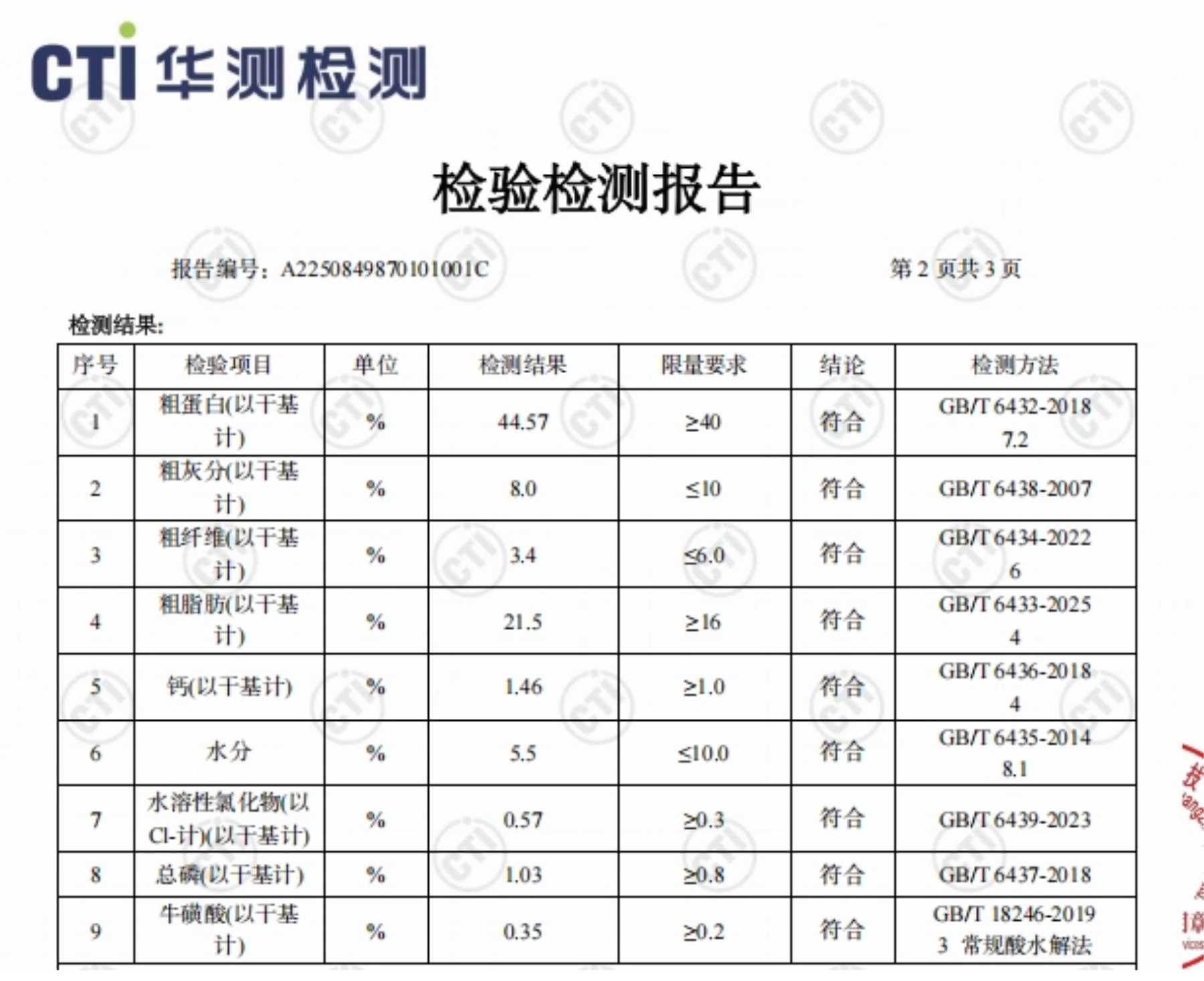 对应的检测报告也公示了具体营养指标,其中粗蛋白含量44.57%、粗脂肪21.5%、牛磺酸0.35%,各项数值都能精准匹配猫咪的日常营养所需,对猫咪健康很有帮助。