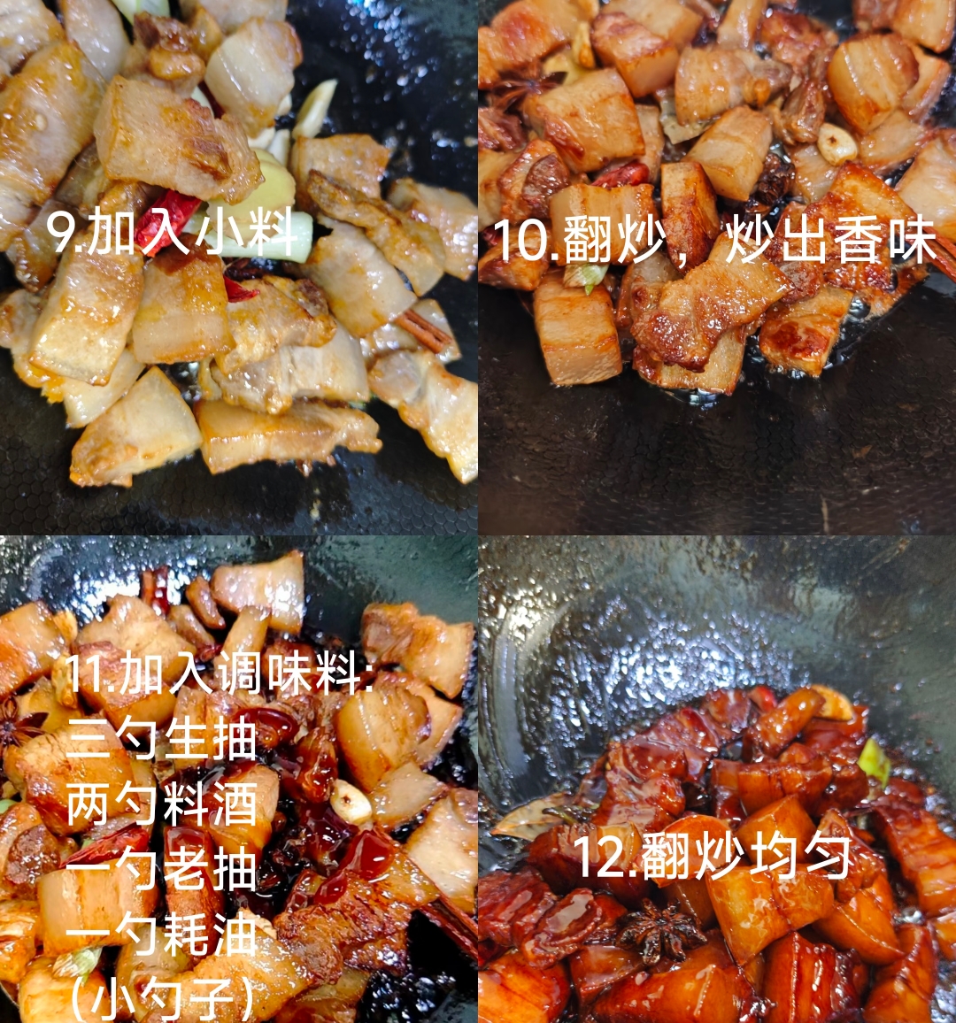 接下来是赋予红烧肉灵魂的“炒糖色”与调味环节。锅中留少许底油,小火慢慢融化冰糖,待糖液由浅黄变成枣红色并冒起细密小泡时,迅速将五花肉倒回锅中快速翻炒。这一步务必眼疾手快,让每一块肉都均匀裹上糖色,赋予其红润透亮的底色。随后加入两个八角、两片香叶、一小段桂皮以及葱姜蒜、干辣椒,煸炒出扑鼻的香料味。此时倒入三勺生抽提鲜、两勺料酒去腥、一勺老抽上色、一勺蚝油增香,继续翻炒均匀,让肉块在香料的簇拥下释放出浓郁的肉香。