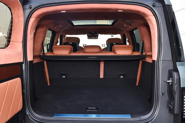 作为大尺寸 5 座 SUV,不光乘坐空间大,装载容积也很可观。仰望 U8 的后备厢常规容积就有 1031 升,纵深将近 1 米,高度 900 多毫米,宽度超 1 米,空间特别规整。后排座椅坐垫能往前翻折,靠背放倒后基本是纯平状态,这时候后备厢纵深接近 2 米,出去露营当大床房用都没问题。后备厢还提供了 2.2 千瓦的 220V 和 180 瓦的 12V 电源接口,要是出去露营或者需要外接电源,都很方便。