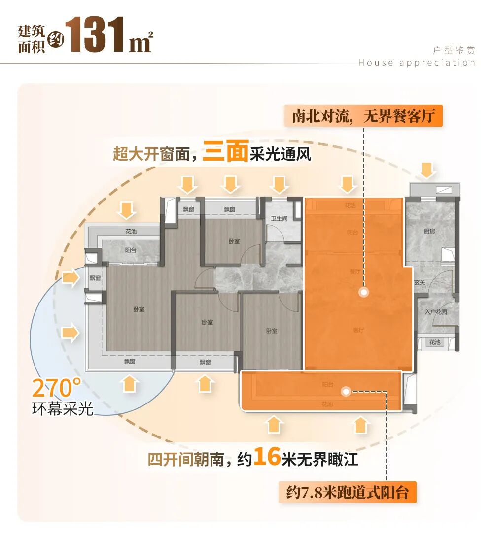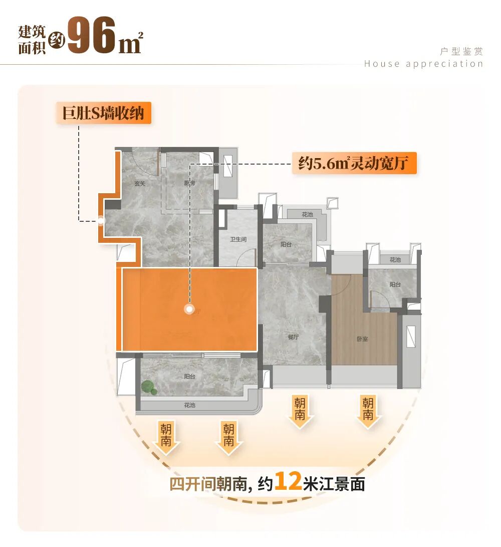 这个户型,四开间朝南,有着约12米观江面,相比市面同面积段产品,不论舒适度,还是景观,都赢在了大气层。