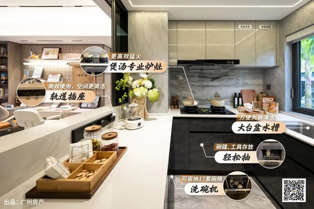镬耳屋、满洲窗、广绣广雕等,让你沉浸式感受岭南文化;榕树剧场,让你体验街坊间烟火温情;不怕裂操作台面,即便你大力剁骨也不怕碎;不干烧、煲汤专用炉灶,让你每天都能喝上老火靓汤...