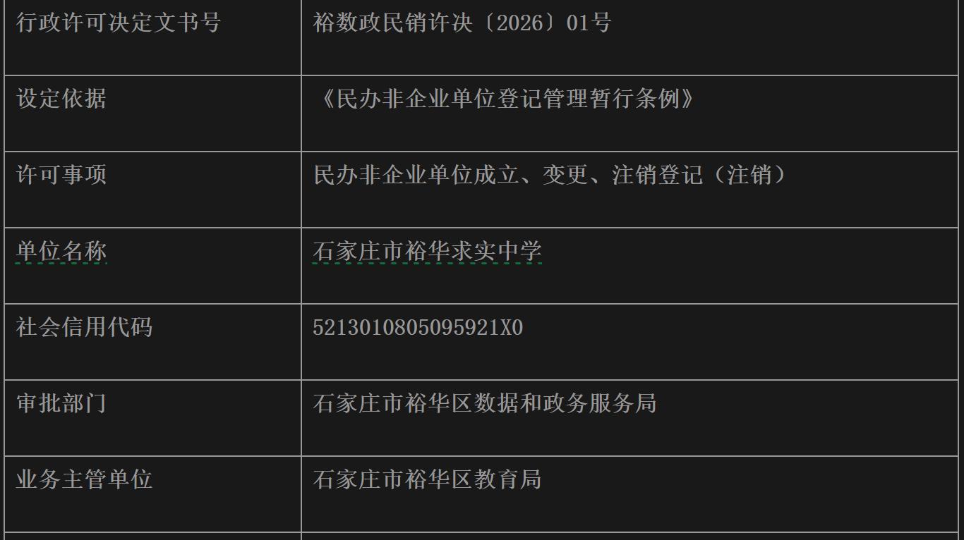 石家庄市裕华求实中学民办非企业单位注销公示来源:石家庄裕华区人民政府、天眼查