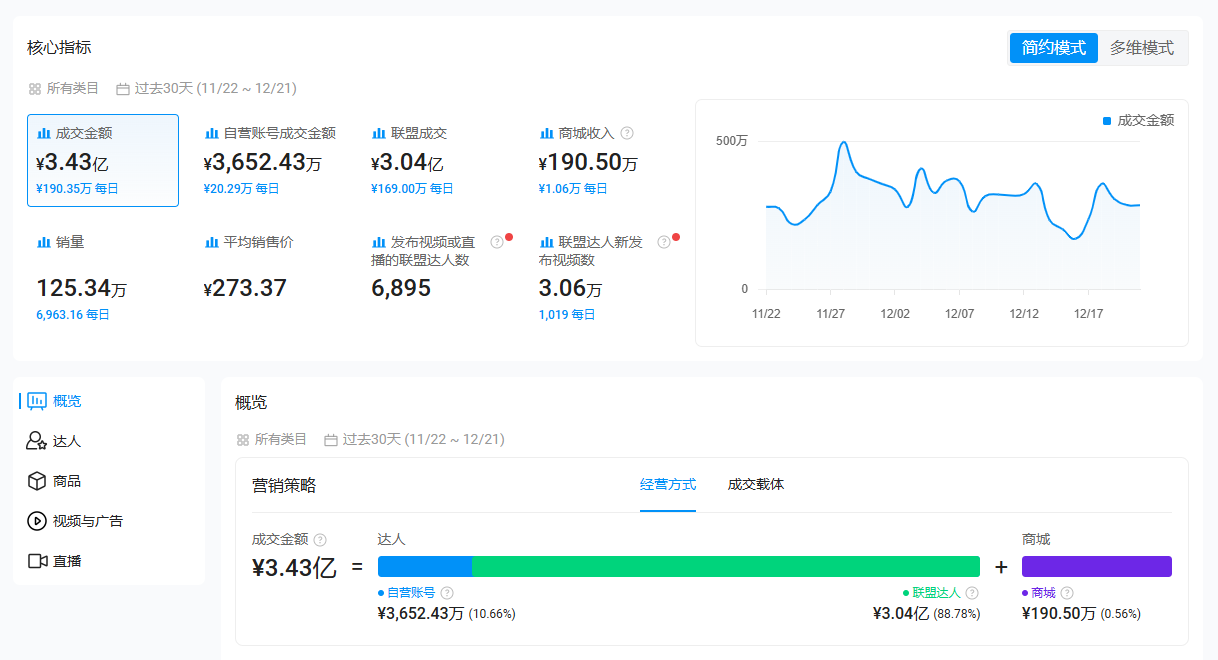 据kalodata的数据显示,近半年来,品牌累计售出了125.34万件商品,总成交金额达到了3.43亿元。其中,通过联盟达人渠道带来的成交额就有3.04亿元,占比高达88.78%,成为核心的增长引擎。