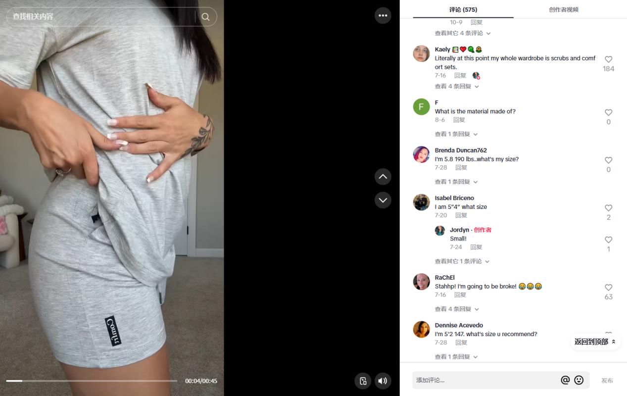 就是这样一段真人上身试穿的展示视频得到了很好的反响,评论区中有大量的潜在消费者主动分享身高、体重数据,询问达人推荐什么尺码。