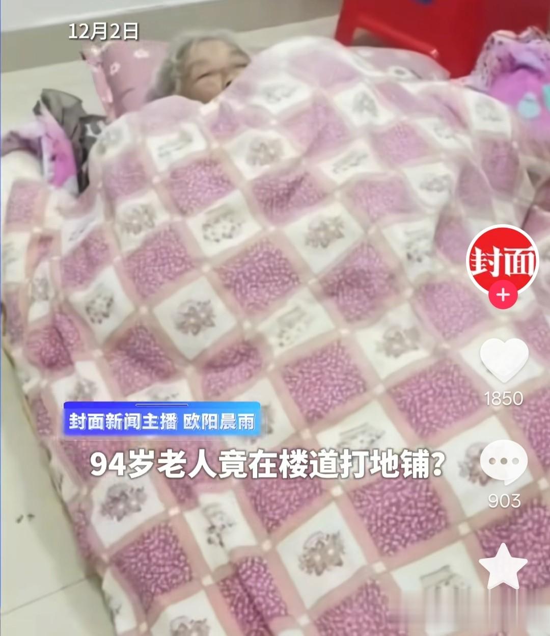 12月1日,南通瑞馨园的一位94岁老奶奶,竟然在小区楼道里打地铺睡觉。