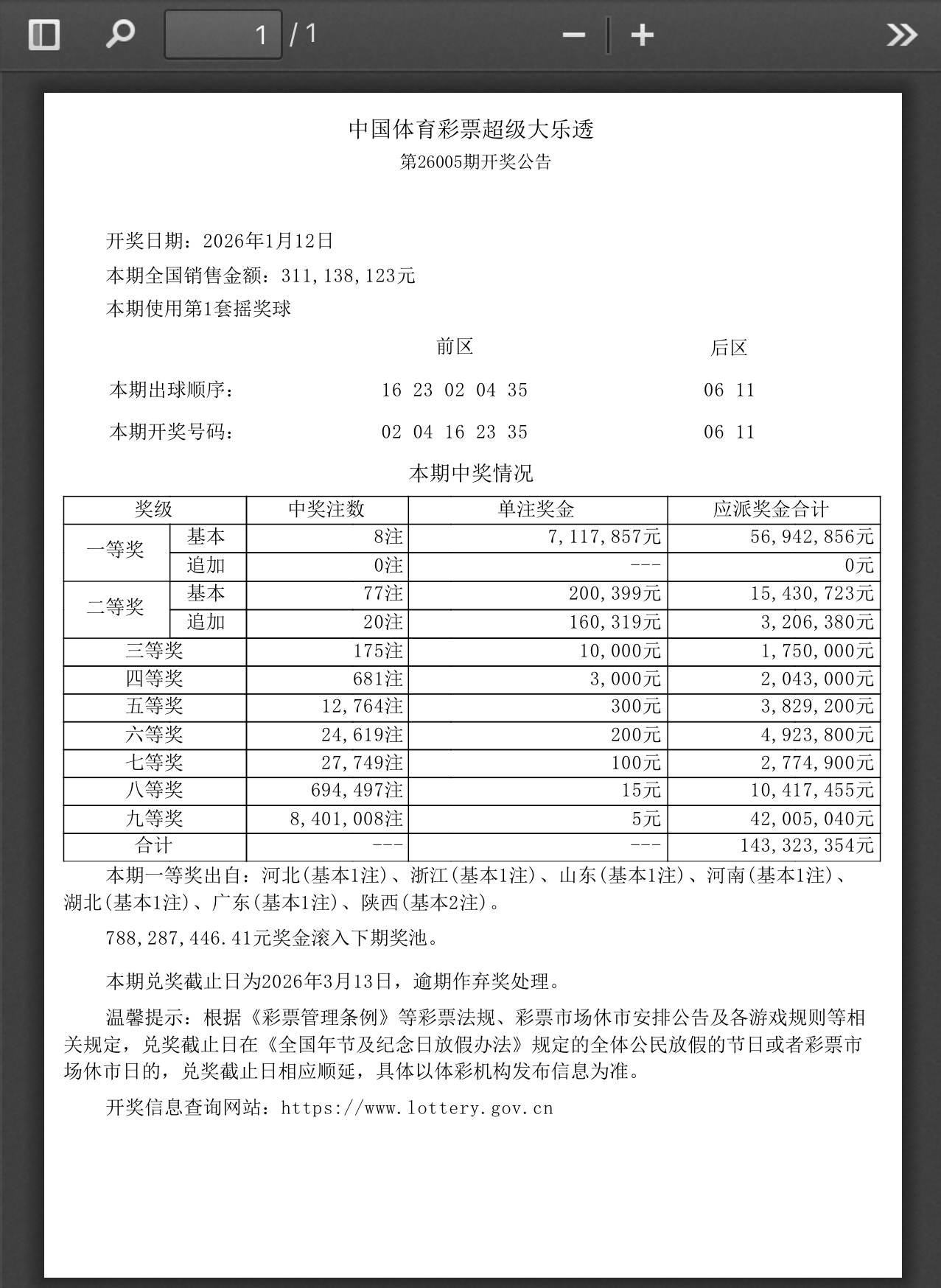体彩超级大乐透2️⃣0️⃣2️⃣️6️⃣005期开奖公告
