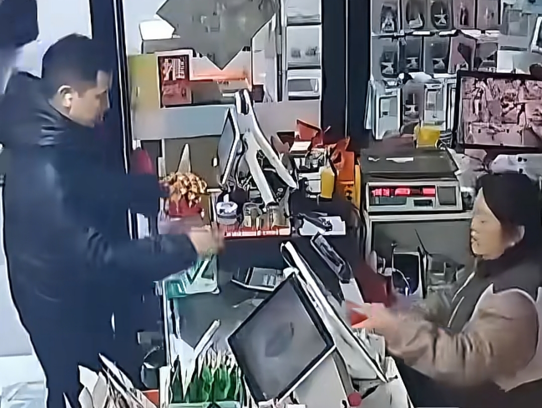当顾客张先生付完款准备出去时,坐在柜台里面的老板娘突然失去了意识,摔倒在地,不省人事。