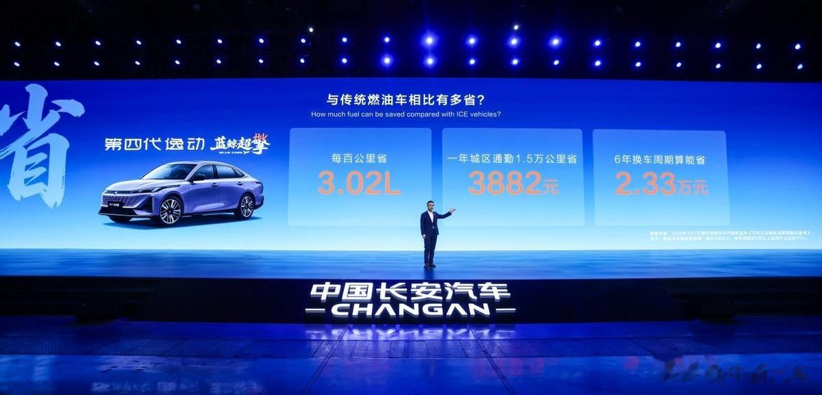 其次用车成本显著降低。在发布会现场,长安汽车执行副总裁杨大勇为消费者算了一笔账:以第四代逸动蓝鲸超擎为例,城区实测百公里综合油耗约2.98升,对比同级传统燃油车6升油耗估算,每百公里能省下3.02升油。按一年跑1.5万公里,一年省油453升,结合92号汽油当前8.57元/升计算,一年就省下3882元。按6年换车周期,光油费就能省下2.33万元。以一台12万的车为例,对比保险费,燃油车比纯电车每年约节省1000元,对比保值率,燃油车比纯电车三年后多卖7200元。
