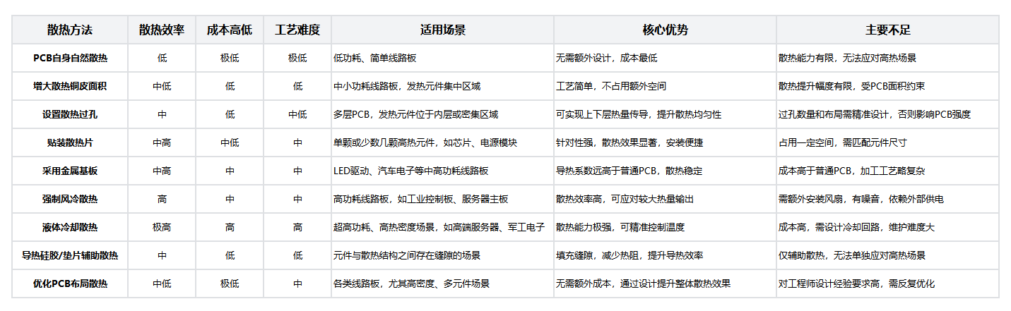 从散热原理来看,主要分为被动散热和主动散热两大类。被动散热依靠自然传导、辐射等方式散发热量,无需额外动力,适合低功耗场景;主动散热则通过外部设备辅助散热,效率更高,适用于高功耗、高热密度线路板。具体对比如下: