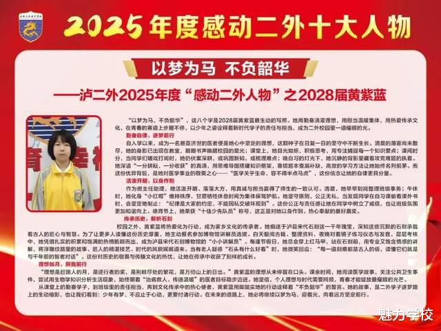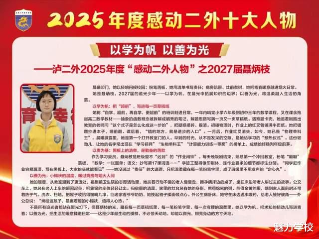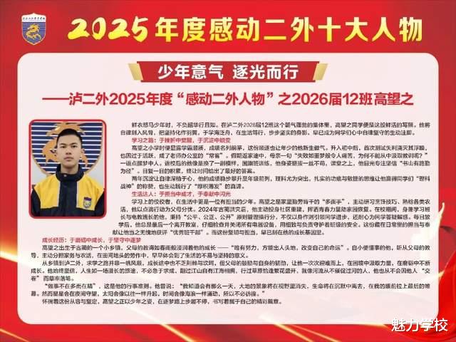 自乡野走来,携父母箴言,砺坚韧初心;于二外成长,凭自律深耕,成理科战神。洪灾逆行显担当,班务躬耕尽热忱。