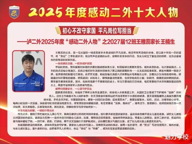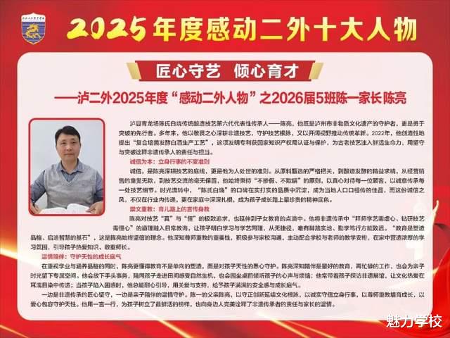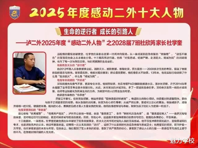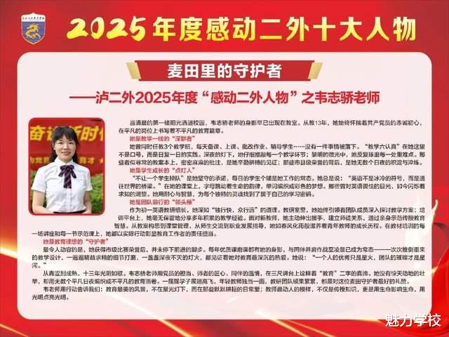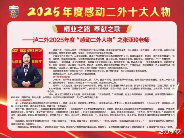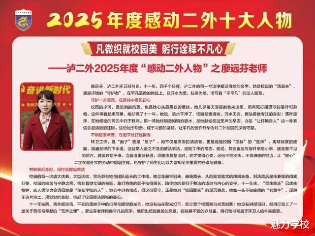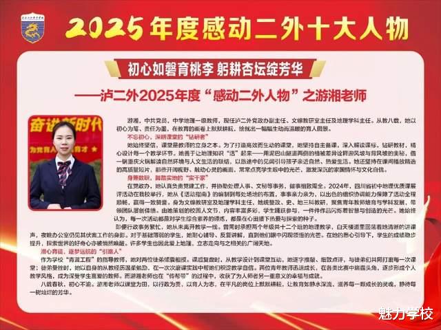 冬日渐暖,微光如炬。泸二外2025年度“感动二外十大人物”的故事,是寒冬里最暖的光,是平凡中最亮的星。他们以坚守诠释初心,用行动传递温情,将点滴感动汇聚成二外校园里的磅礴力量。这份感动,不止闪耀于2025的时光里,更将照亮2026的前行之路。愿每一份温暖都被铭记,每一种力量都被传承,让感动常在,让美好永存,共同书写泸二外更加璀璨的新篇章。