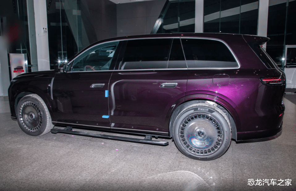 车身侧面没有过多线条刻画,毕竟自身定位摆在那里,设计元素太多反而有种画蛇添足的感觉。笔直腰线贯穿车身,半隐藏式门把手兼顾美观性和实用性。除了单色车漆,官方还提供双色车漆可选,这也是当前旗舰级车型的常规操作,毫无疑问双色车漆更显尊贵豪华。22寸大饼状银色轮圈相当显眼,这是一个非常夸张的数据,再次凸显自身的旗舰级身份,有需要的用户还可以花费两万元选装支持电动吸合以及自动开合的全车车门。得益于三腔空悬的加持,整个车身高度的调节范围比较广泛,在不同用车场景下提供相对应的便捷。