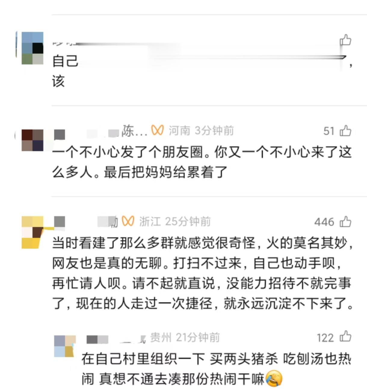 赶来的网友也满肚子冤屈。有人开车几百公里赴约,只是想感受杀年猪的年味,却被贴上“闲人”标签;还有真心搭把手的人,也被混在人群里的围观者连累,成了“蹭吃蹭喝”的代表。评论区里更是吵成一团,有人替姑娘喊冤,说她从没求着谁来;也有人骂网友没边界感,这场原本的善意互助,最后变成了互相指责的罗生门。