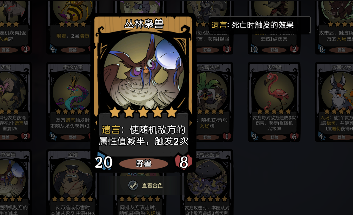丛林枭兽这张牌的的遗言效果是使随机敌方的属性值减半,变成金色以后是触发两次,不管你多大的身材,我一次直接减掉一半属性,虽然是随机敌方,但是架不住触发的次数多,配合鼠王和死灵傀儡师,直接指数级触发,不管你多大身材直接给你减成0/1,这对养身材的玩法简直是噩梦。