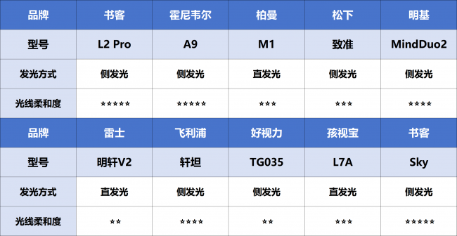 柏曼M1、松下致准和孩视宝L7A的柔光效果一般,光线分布还可以,就是在高亮度下直视时的时候可能会出现轻微眩光,也属于可用范围。最后的雷士明轩V2和好视力TG035的柔和度偏弱,光线集中或边缘过渡明显,直视或近距离使用容易刺眼或产生视觉疲劳,长期学习时舒适度一般。