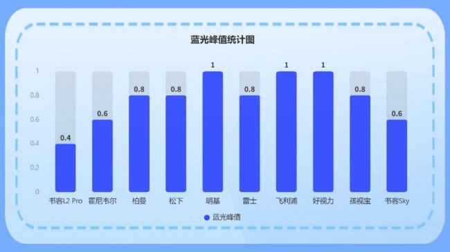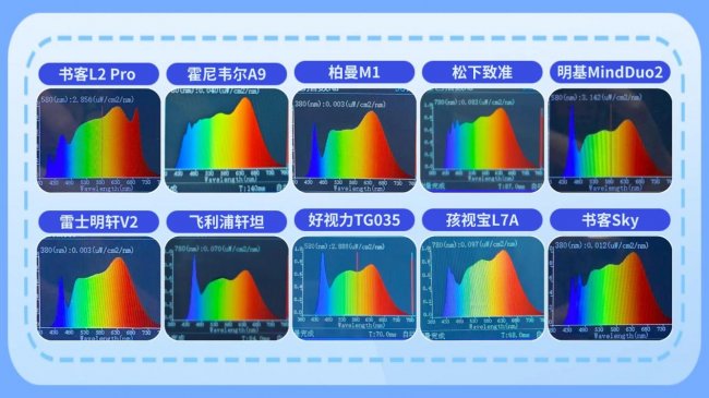 书客L2 Pro的实测蓝光峰值被压制到0.4的极低水平,这是因为它用了紫光激发全光谱技术,从光源结构上就减少了有害蓝光的产生,光线更温和,也更接近自然光,接近理想的护眼状态。霍尼韦尔A9和书客Sky的蓝光峰值是0.6,也算不错,属于安全范围内,长时间用眼也不会太刺激。其他几款台灯的蓝光峰值普遍在0.8到1.0之间,虽然也算能用,但大多只是通过调暗亮度来减轻刺激感,护眼效果相对没有那么彻底,但这几款台灯中,松下致准、孩视宝L7A的蓝光在0.8左右,同时光谱连续性相对更好一些,各波段过渡更加自然,柏曼M1和雷士明轩V2的蓝光峰值也在0.8,表现相对好些。