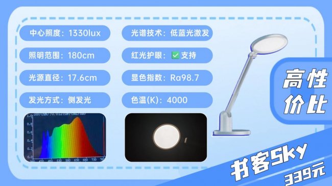 · 护眼不打折:书客Sky这款台灯在护眼效果上是本次测评中百元台灯中表现最全面的,控制蓝光和补全红光都做到了。它搭载RRT2.0红光养眼技术和硬件级低蓝光技术,将415-455nm有害蓝光峰值抑制至0.6,实测可缓解81%用眼疲劳,媲美千元级产品。
