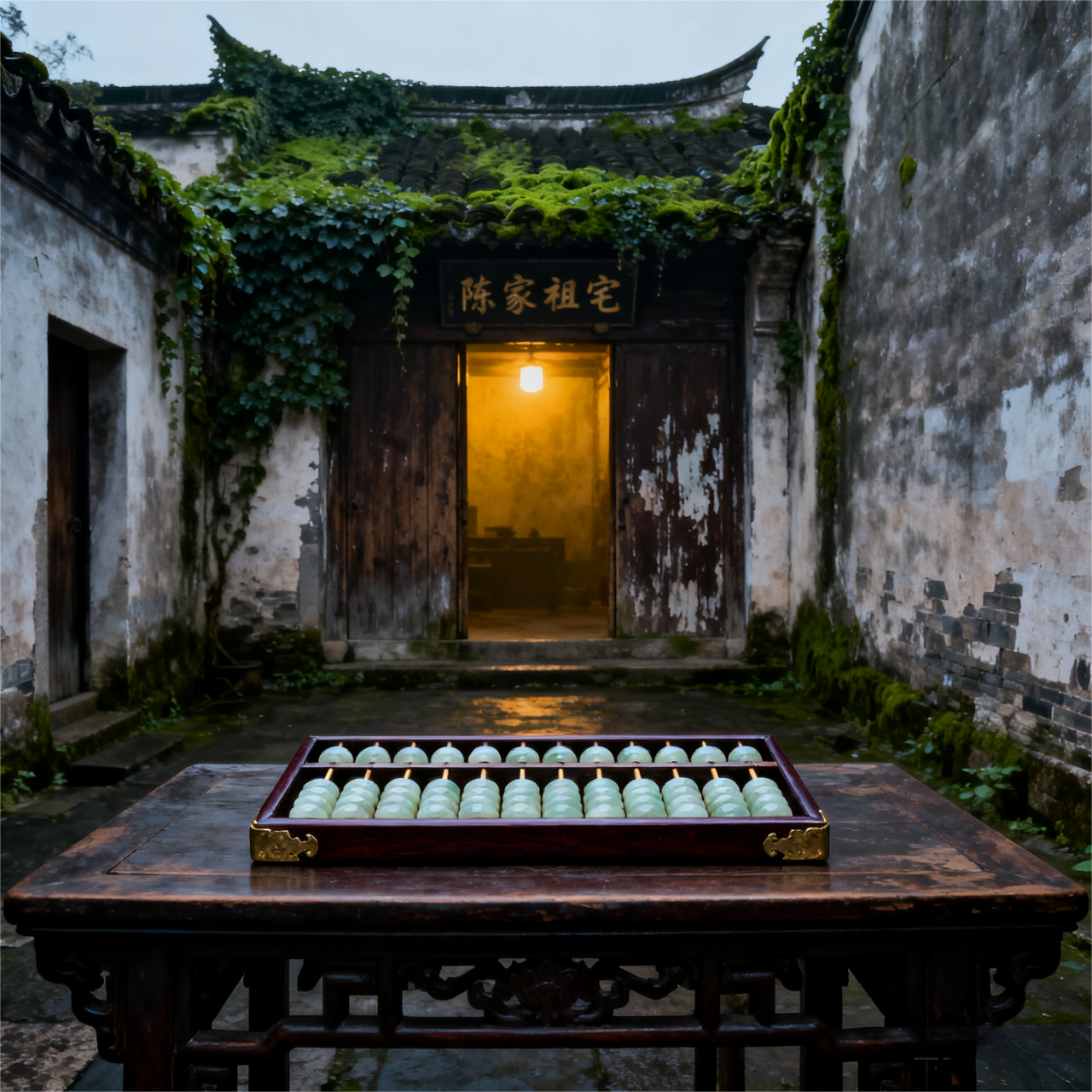 打开柜门的一刹那,我的心跳得厉害。算盘里面,紫檀木框里嵌着铜角,算珠是羊脂玉做的,在晨光下透出温润的光泽。它很干净,干净得与这破屋子格格不入,我伸手一摸,玉珠冰凉,竟无一丝灰尘。