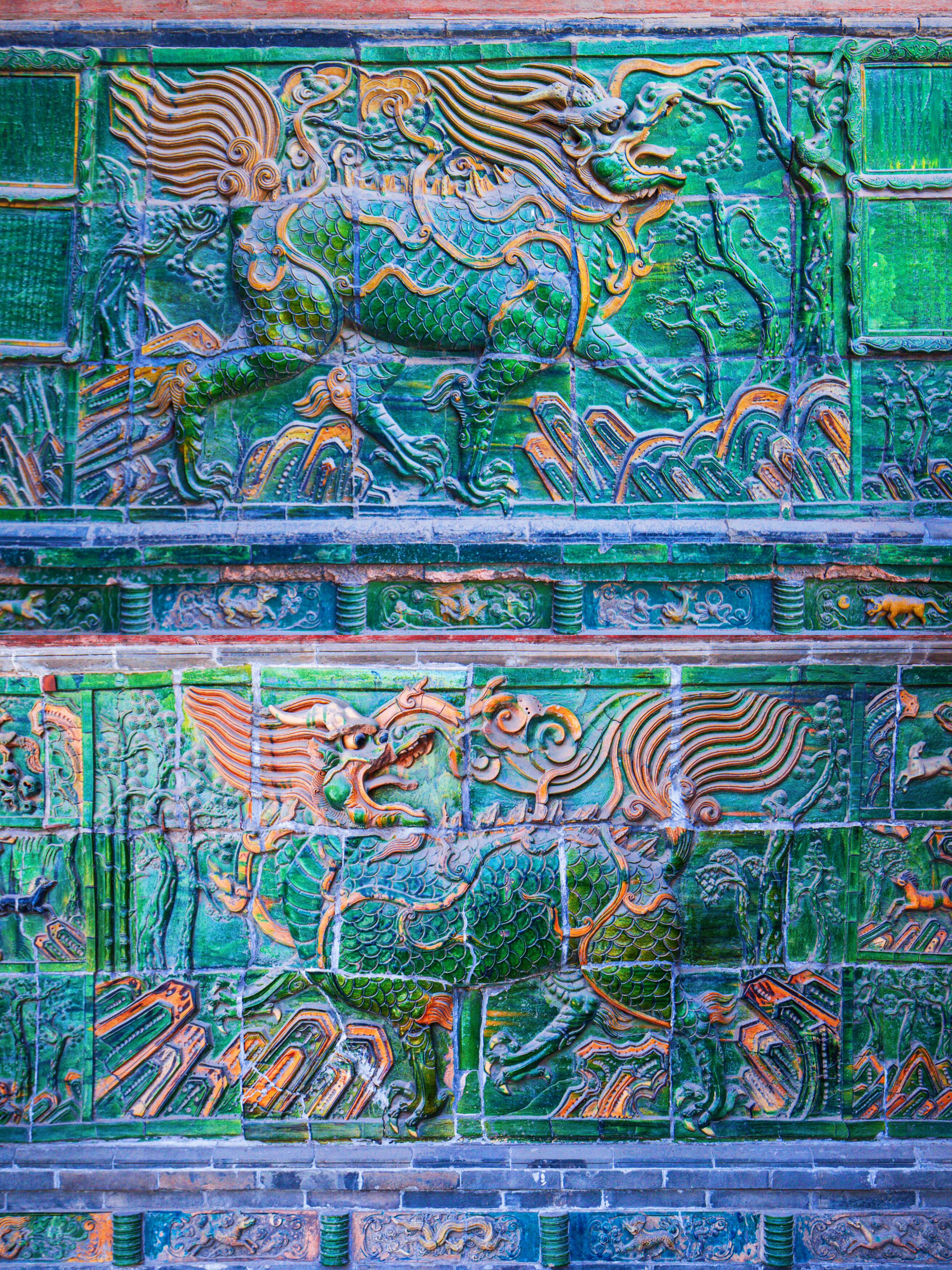 如果说戏台是听觉的盛宴,那么屋顶就是视觉的狂欢。你得找个阳光好的日子,眯起眼睛往上看。那蓝、绿、黄三色琉璃瓦,在阳光下不是死板的颜色,而是流动的光,像是某种深海生物的鳞片。而在屋脊之上,更是一场无声的百兽夜行图。这里布满了栩栩如生的脊兽,龙、凤、狮、马,姿态各异,仿佛下一秒就要挣脱琉璃的束缚,腾空而去。