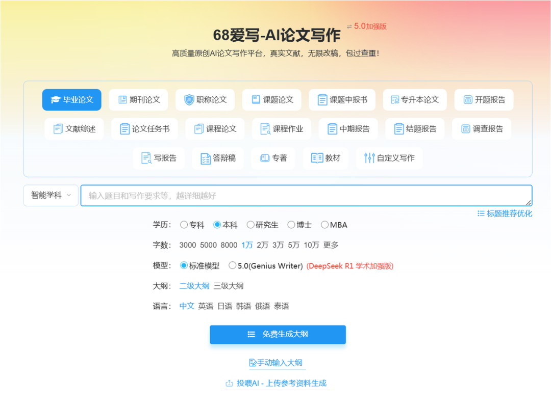 68爱写AI,就像一台专为学术写作打造的高速引擎,它将效率和质量完美融合。如果是那种对时间有严格要求,又渴望高质量AI论文生成的学术写作者,那么68爱写AI绝对能成为得力AI论文写作助手。它不仅能帮AI一键生成论文,更在论文降重和数据安全方面给到满满的安心感。