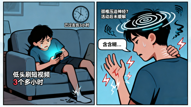 “那天周末,我窝在沙发上刷短视频,低头看了3个多小时,突然觉得头晕得厉害,像天旋地转,右手还麻得握不住手机,以为是颈椎压到神经了,起来活动了半小时,头晕没好,说话都有点含糊。”28岁的小林去医院检查后才知道,不是颈椎的问题,是长期低头让气血堵在颈部和脑部,再这么下去,可能会有更严重的风险。