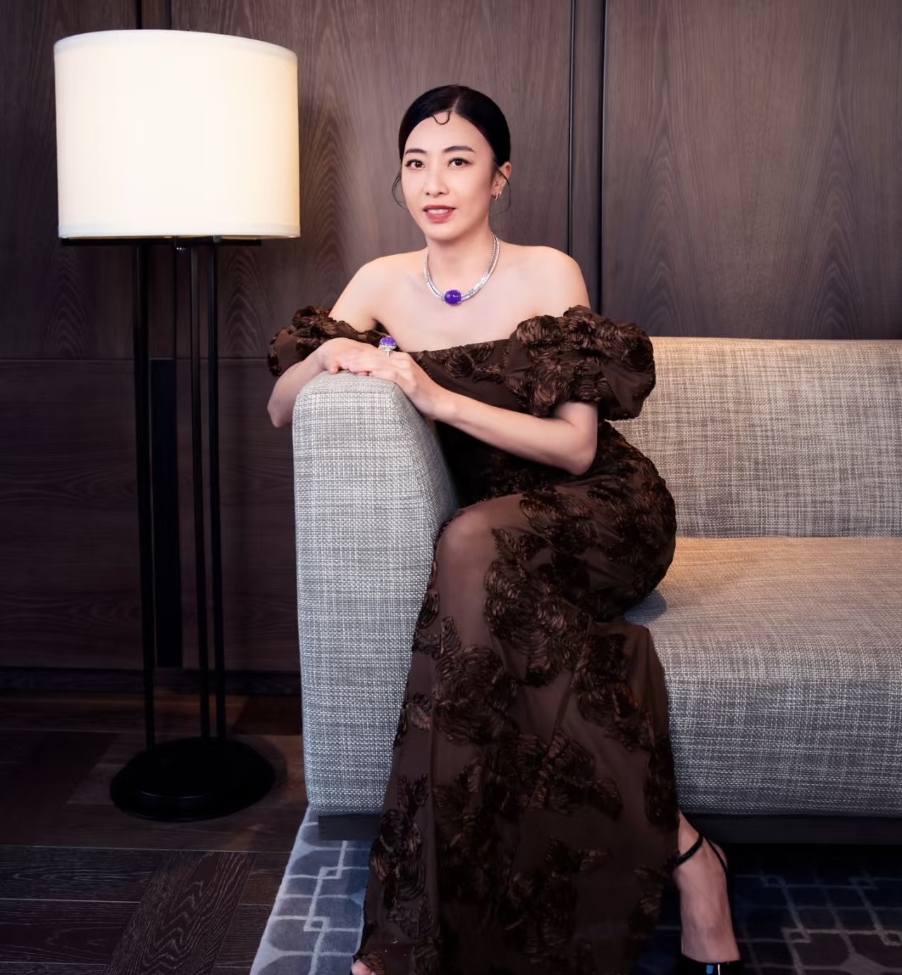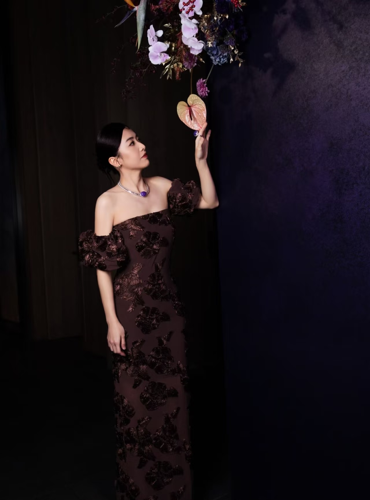 不过相较于朱茵中规中矩的礼服款式,一袭一字肩复古咖色礼服,搭配抢眼的紫翡翠鸽子蛋项链的甘比,则更加令人瞩目和耀眼。