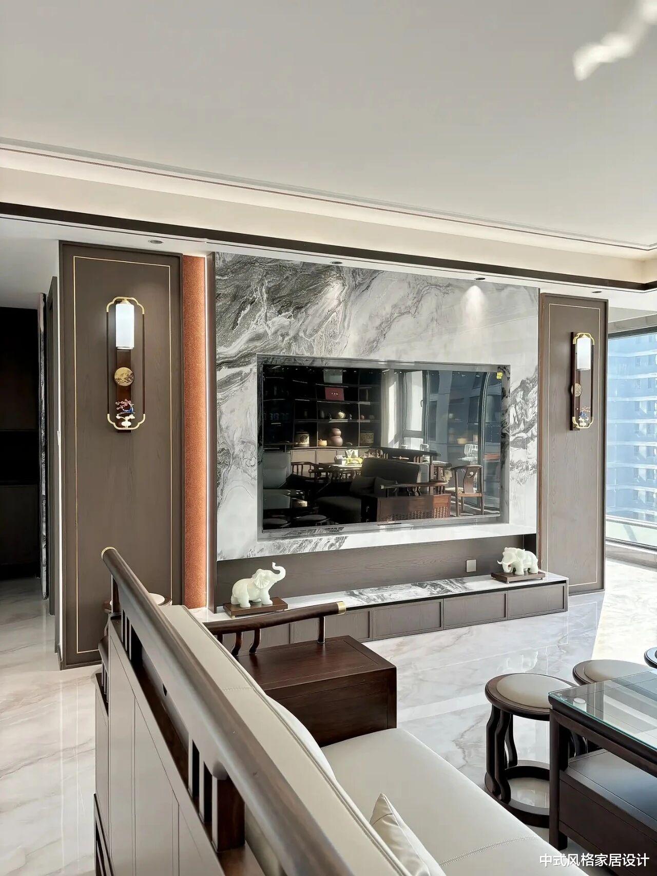 视线转向电视背景墙,一种现代东方的张力扑面而来。设计师大胆选用大花纹岩板,其天然纹理如一幅酣畅淋漓的泼墨山水画,寥寥数笔,便勾勒出恢弘气势,将中式美学中的写意精神展现得淋漓尽致。