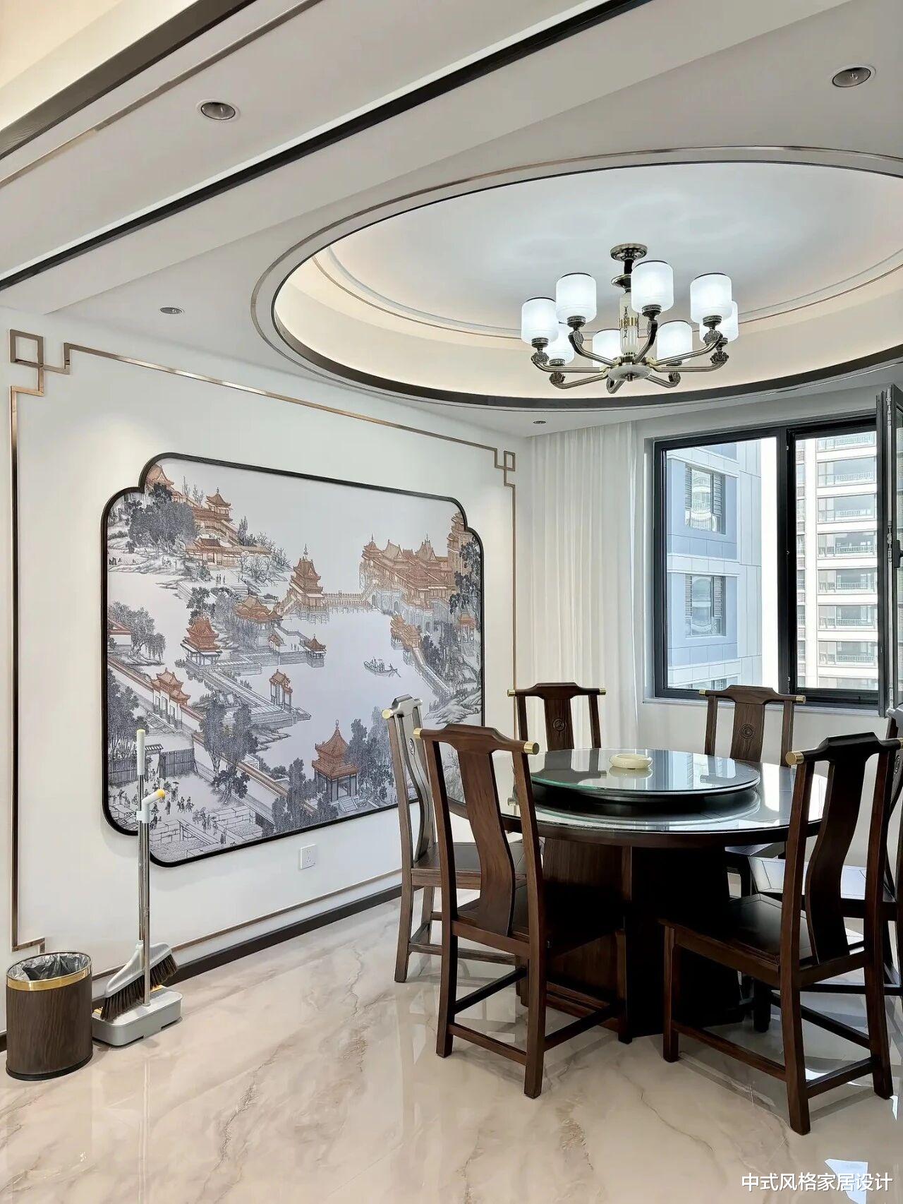 餐厅是家人团聚、共享美味的核心区域。设计师于此巧妙运用了“天圆地方”这一古老的东方哲学理念。顶部打造了精致的圆形叠级吊顶,如同一轮满月悬于上方,寓意团圆美满。与之呼应的,是素雅而有质感的壁布墙面,仿佛宣纸般的底衬,烘托出宁静的氛围。