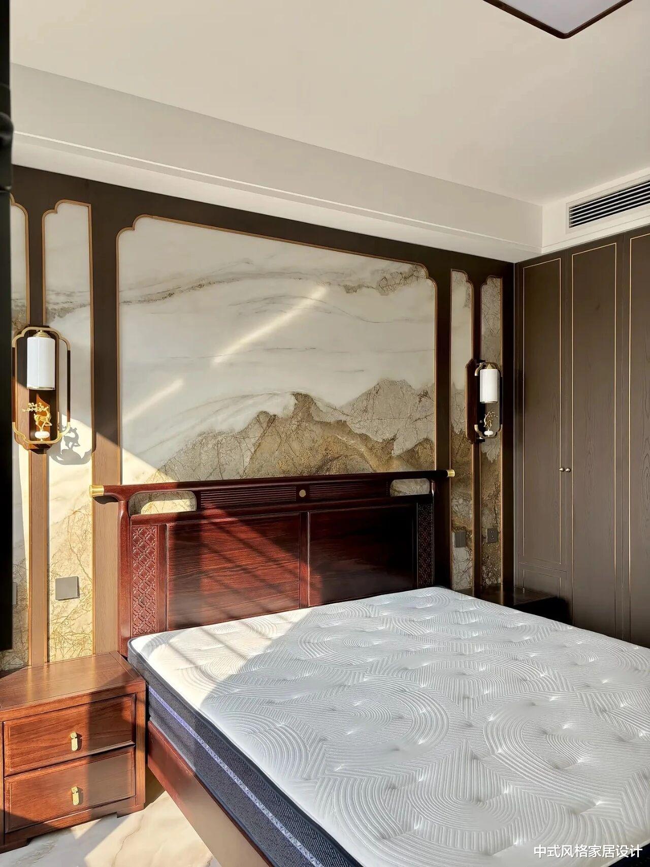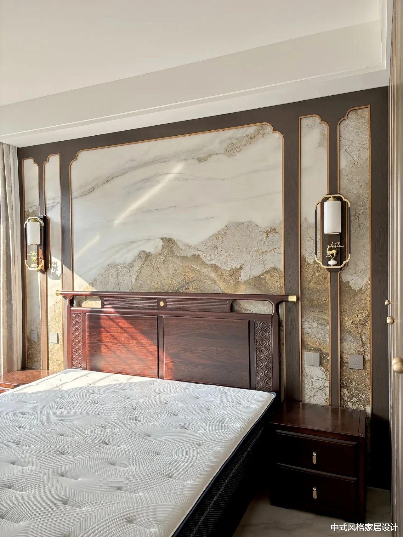 更具巧思的是其悬空设计。整面背景墙仿佛挣脱重力束缚,轻盈地“悬浮”于地面之上。这一设计,不仅在视觉上极大地减轻了体量感,让空间更显通透开阔,更带来了无可比拟的实用优势——清洁变得轻而易举,再无卫生死角。传统意境与现代工艺、审美与实用,在这里达成了完美的共识。