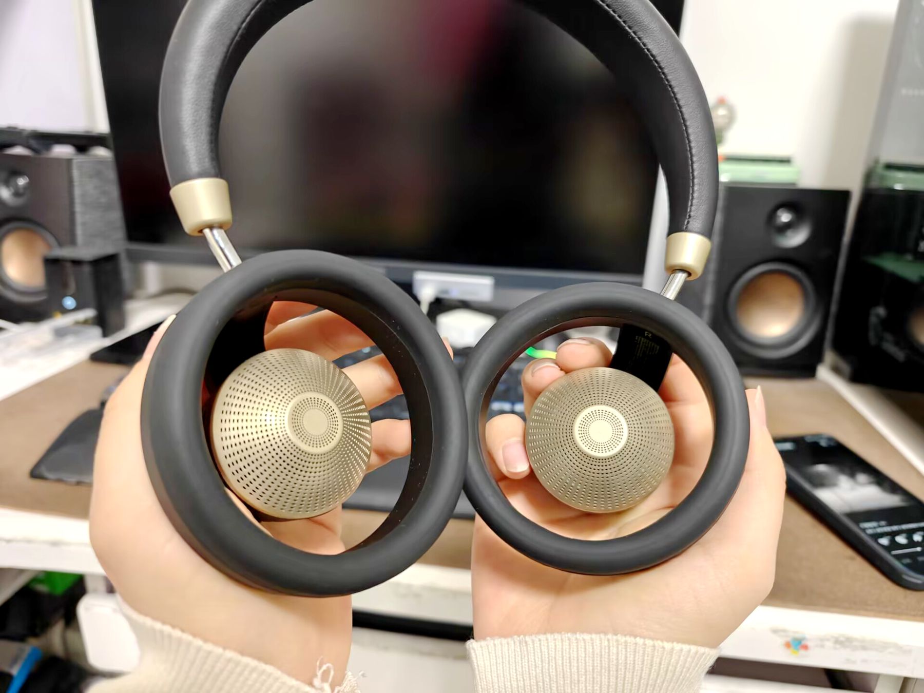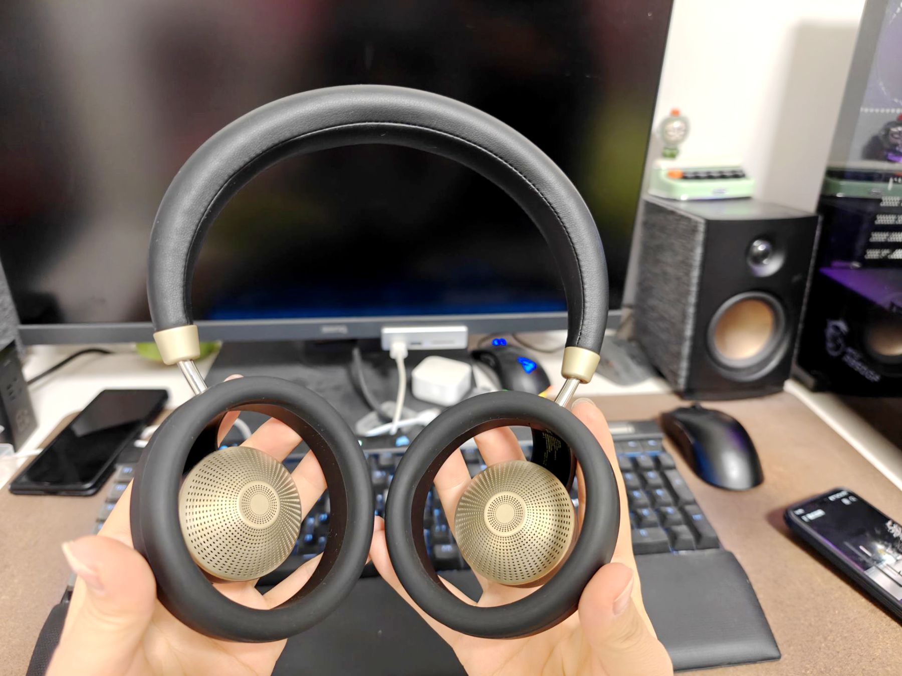 最惊喜的是它的轻量化工艺,整机重量仅 280g,长时间佩戴也不会压得耳根疼。耳罩采用蛋白皮材质,触感柔软亲肤,内部填充高弹性记忆棉,能完美贴合耳廓,就算戴眼镜也不会有压迫感。