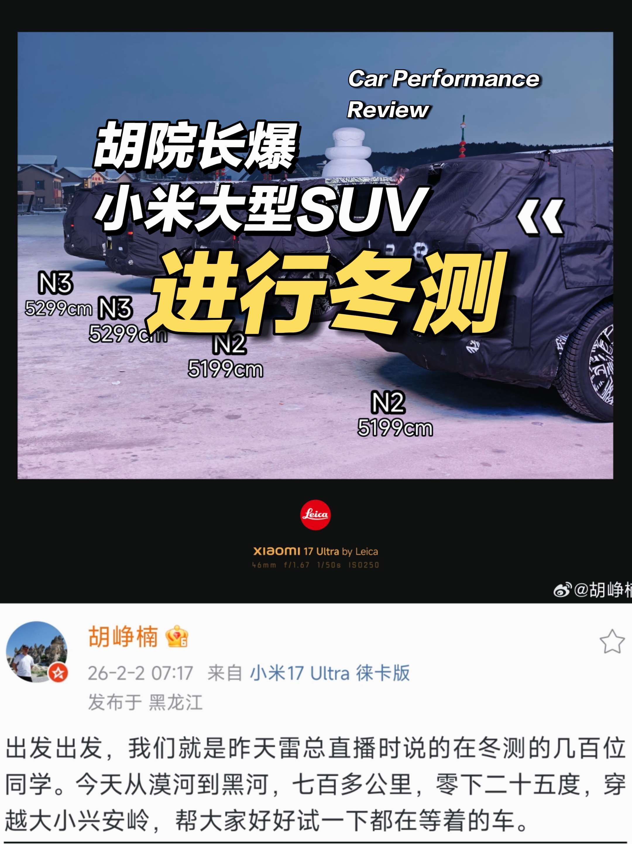 刚刚!胡院长爆料小米昆仑平台两款大型SUV,正在漠河至黑河进行冬测!