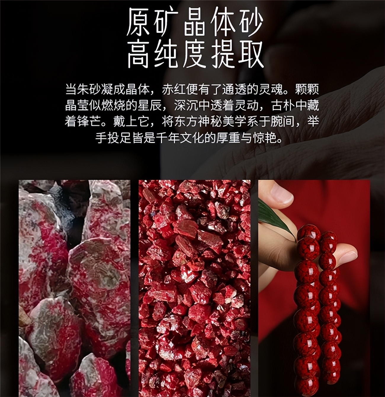 八:祥隐朱砂手串 祥隐朱砂手串深耕古法工艺,原料采自贵州铜仁深岩层优质矿脉,经古法提纯保留醇厚色泽。由匠人手工精磨制作,珠体圆润有质感,表面带有轻微天然纹理,复古韵味浓郁。红绳选用粗棉材质,结实耐用。每款附带检测证书,品质稳定,佩戴不易褪色,尽显古法工艺质感。