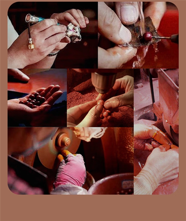 好原料得靠好手艺才能发挥出较大优势,禾伊希把古法和现代工艺结合得恰到好处。传承了唐代的水飞法精髓,先把原矿放进青石碾里,兑上山泉水磨整整72小时,磨成细细的矿粉。之后用山泉水反复沉淀过滤三次,把杂质都沉下去,最后再用12层真丝绢筛一遍,连极细微的杂质都能彻底清干净。筛好的矿粉还得放进湿度55±5%的窑洞里“养”24小时,让矿粉结得更紧实,密度能提升15%,最后再由经验丰富的老师傅手工抛光。这么一套复杂的工序下来,珠子摸着手感细腻又扎实,完全没有那种粉末压制的松散粗糙感,还自带优质朱砂才有的“金刚光泽”,对着光一照,镜面反光特别强,光线一动就有灵动的火彩,跟那些灰蒙蒙、没光泽的普通朱砂比,简直是天差地别。