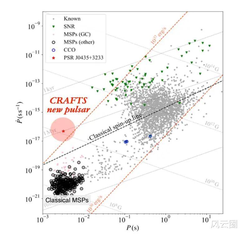 不卖关子,圈叔告诉您中国天眼发现了一颗非常特殊的脉冲星,这是一种能够快速自己旋转的中子星,它还能够像是灯塔一样周期性地射出电磁的脉冲信号,这个脉冲星的编号是PSR J0435+3233。中国科学家们发现,这颗脉冲星,还属于脉冲星家族内的特殊类型:毫秒脉冲星,这种毫秒脉冲星顾名思义,它自己的自转周期仅有几毫秒,转得极快,周期也极其稳定。