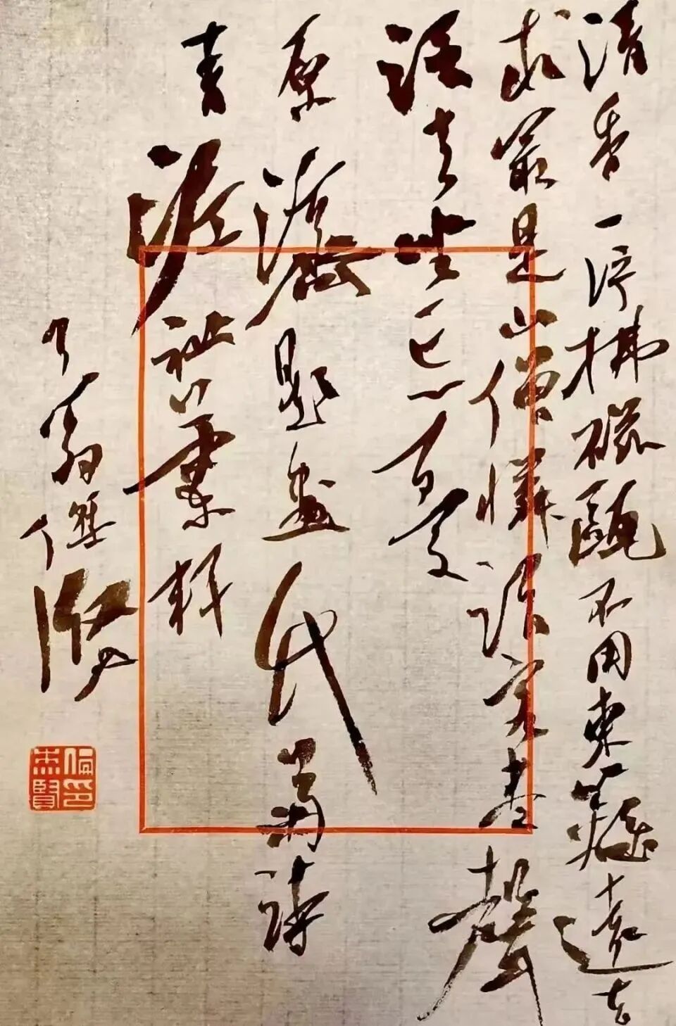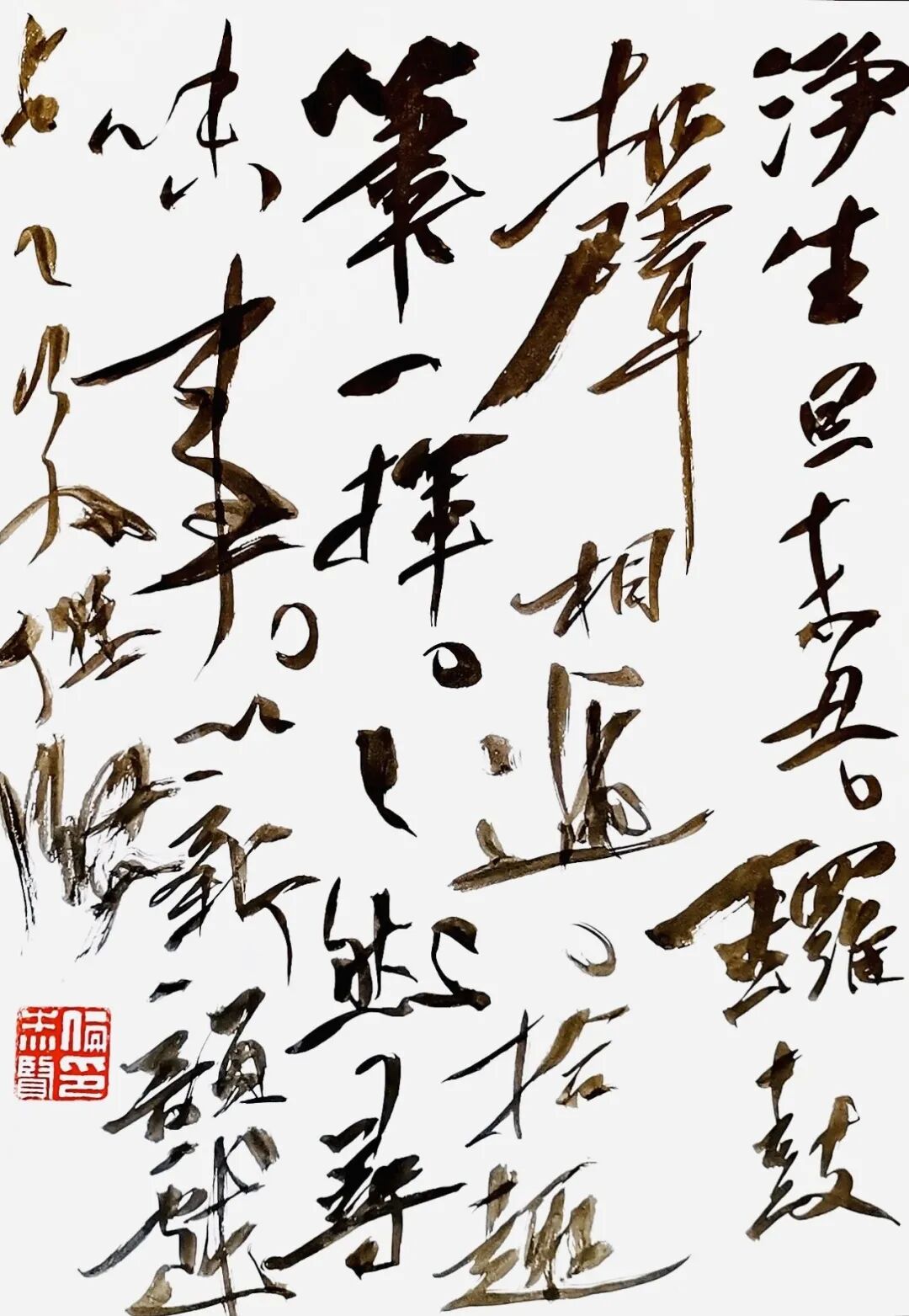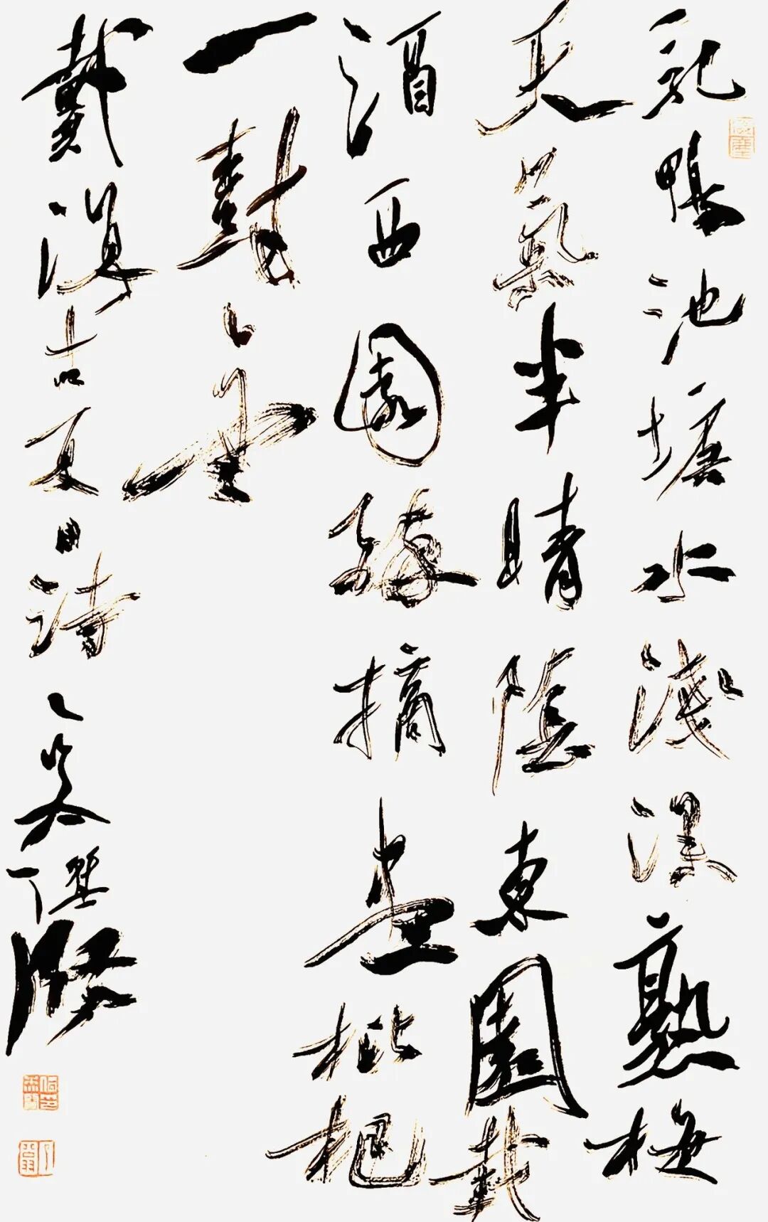 先生作小草,根脉二王,溯源晋唐,旁参孙过庭《书谱》、怀素小草之旨,笔法规整,骨力内蕴。中锋立质,侧锋生姿,提按转折,无不如意,点画如锥画沙、屋漏痕,刚柔相济,韵致天成。其书不激不厉,从容蕴藉,无狂草之纵肆,有雅草之清和,字势欹正相生,章法疏密得宜,墨色浓淡相渗,气脉贯通全篇,恍若清泉漱石,泠泠有声,松风入林,悠悠自远。复融汉隶之朴厚、魏碑之方劲于草法,帖碑相融,金石气生,故其草虽精微,却无柔靡之弊,于流丽中见沉雄,于典雅中露风骨,此乃先生深研古法、守正出新之妙也。