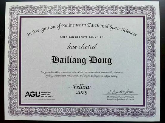 2025年12月17日,美国地球物理联合会(American Geophysical Union, AGU)在美国路易斯安那州新奥尔良举行的AGU年会上正式授予中国地质大学(北京)董海良教授“AGU会士”荣誉,以表彰他在生物地球化学及相关地球科学领域的卓越贡献。