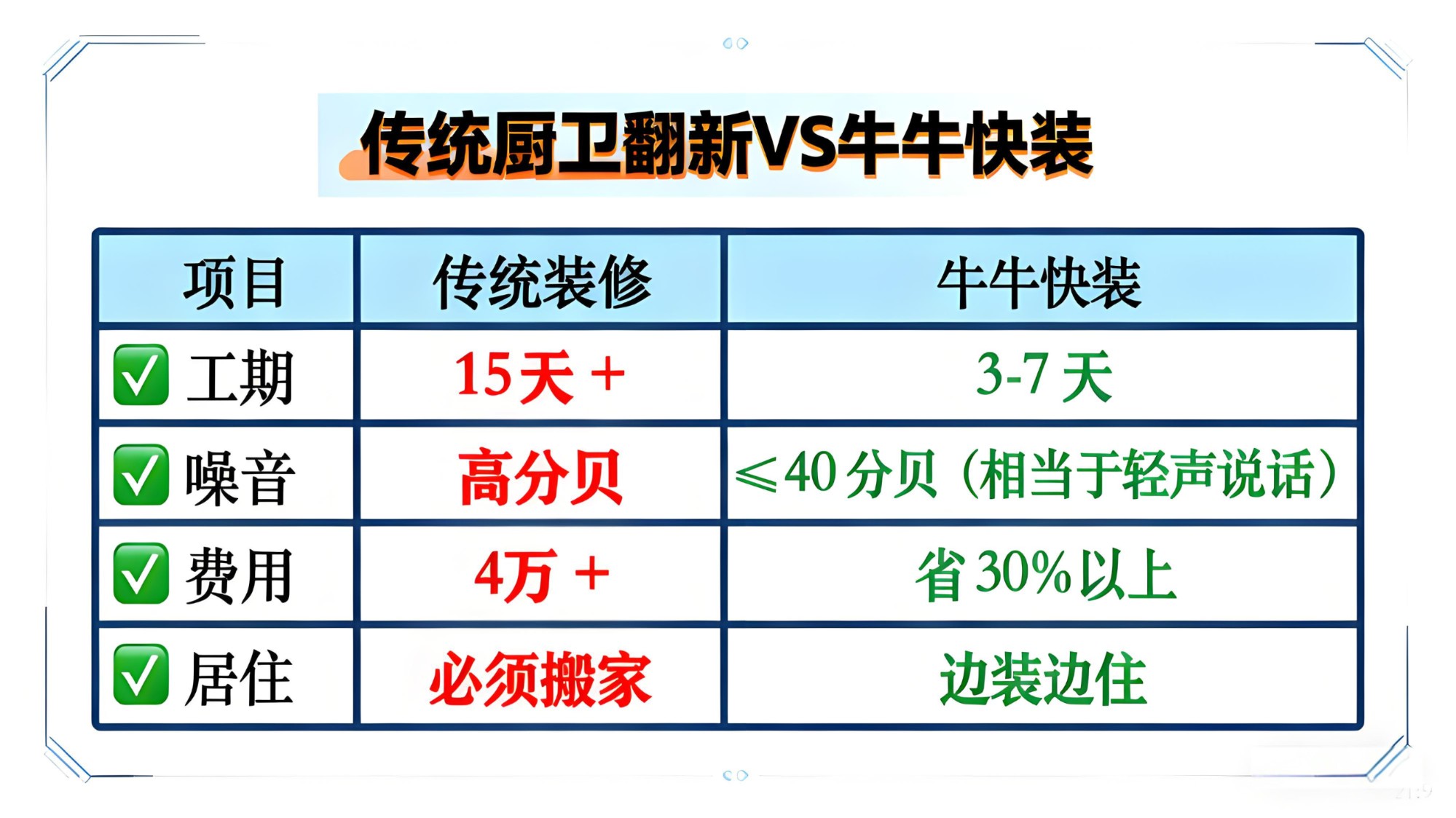 比传统装修节省30%费用。传统装修的打砸清运费用占总费用的20%左右,牛牛快装省去了这部分成本,加上材料集中采购的优势,价格比传统装修低30%。比如李阿姨家传统装修报价5万,牛牛快装只花了3.5万,省下来的钱买了新的洗衣机和冰箱,性价比超高。