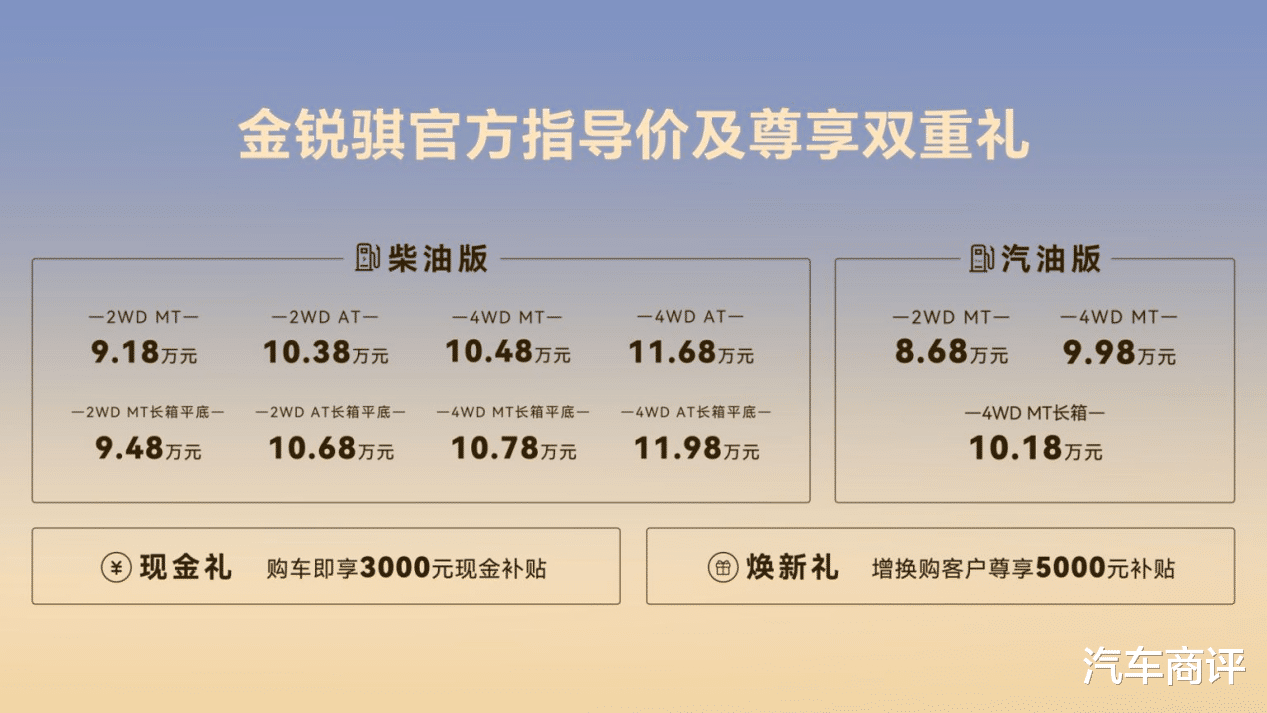 作为主要面向商用市场的皮卡车型,金锐骐此次继续提供汽油、柴油双动力。其中,新车的三款汽油版指导价9.18万-10.18万、八款柴油版车型指导价9.18万-11.98万。作为经历20年发展历程的经典皮卡车型,锐骐家族作为细分市场内的元老级IP,早已得到了大量用户认可。