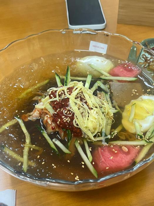 荞麦冷面劲道爽滑,汤汁酸甜够味,里面的牛肉片、泡菜清爽解腻。加份溏心蛋,口感更丰富。