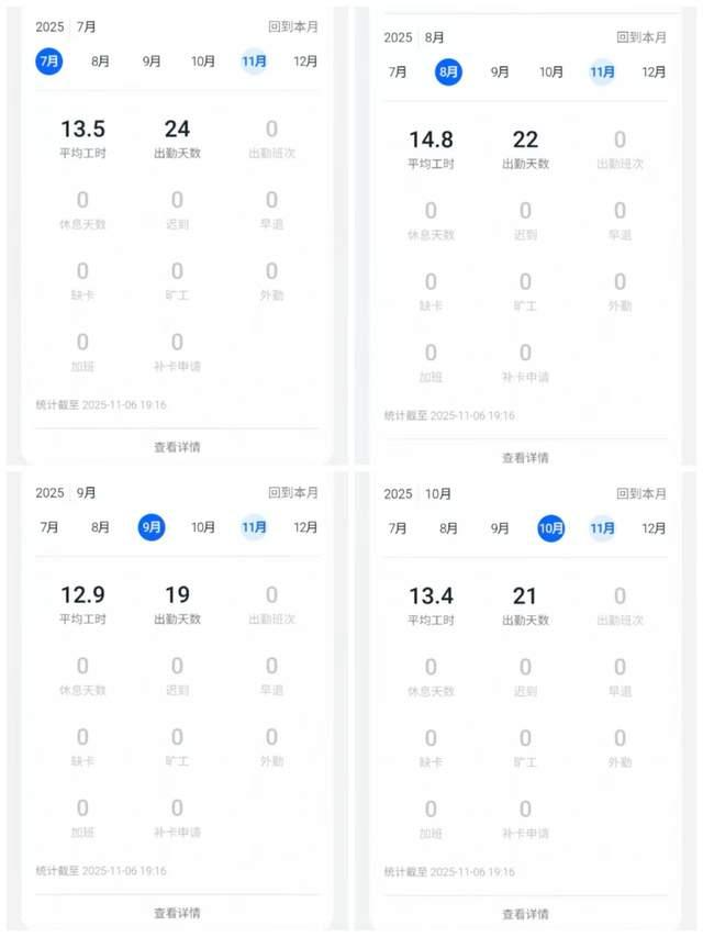 家属调取钉钉记录发现,小乐去世前4个月日均工时高达13小时,其中8月日均14.8小时,长期处于过度疲劳状态。其生前聊天记录多次提及加班引发的健康危机: