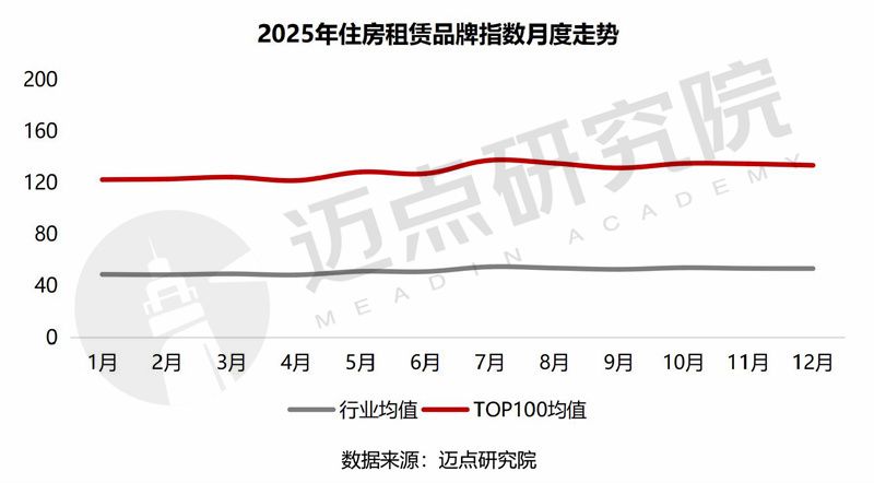 从指数来看,2025年TOP100住房租赁品牌的年度均值为129.46,行业整体均值为51.77,头部品牌的集聚效应十分显著。从月度走势来看,指数呈现“阶梯式上行后趋稳”的态势。2025年5月与6月,行业把握毕业季租赁需求,积极进行营销推广,推动指数出现首个增长波段。随后,指数于7月升至全年最高点(TOP100均值137.46),市场声量达到顶峰。此后直至年底,指数虽小幅回调,但仍持续运行于高位区间,反映出下半年品牌传播活跃度保持强劲。