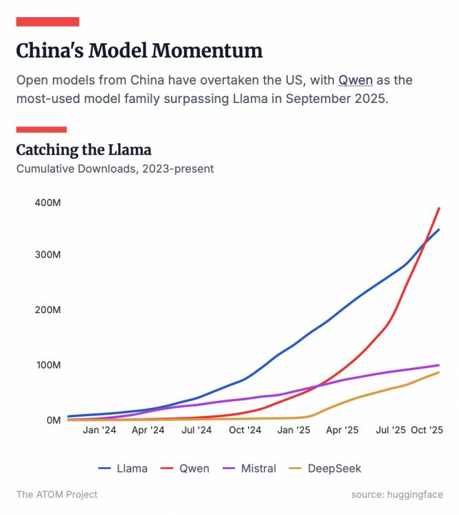 到了2025年下半年,开源的权杖发生了转移。根据全球最大的AI开源社区HuggingFace的数据,2025年7月是一个分水岭:中国开源模型的下载量首次超过了美国,其中千问位居第一。