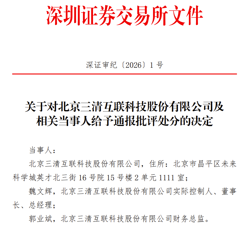 据大河财立方近日报道,深交所发布通报,因多项信息披露违规及未配合尽职调查,北京三清互联科技股份有限公司及相关当事人被予以通报批评。