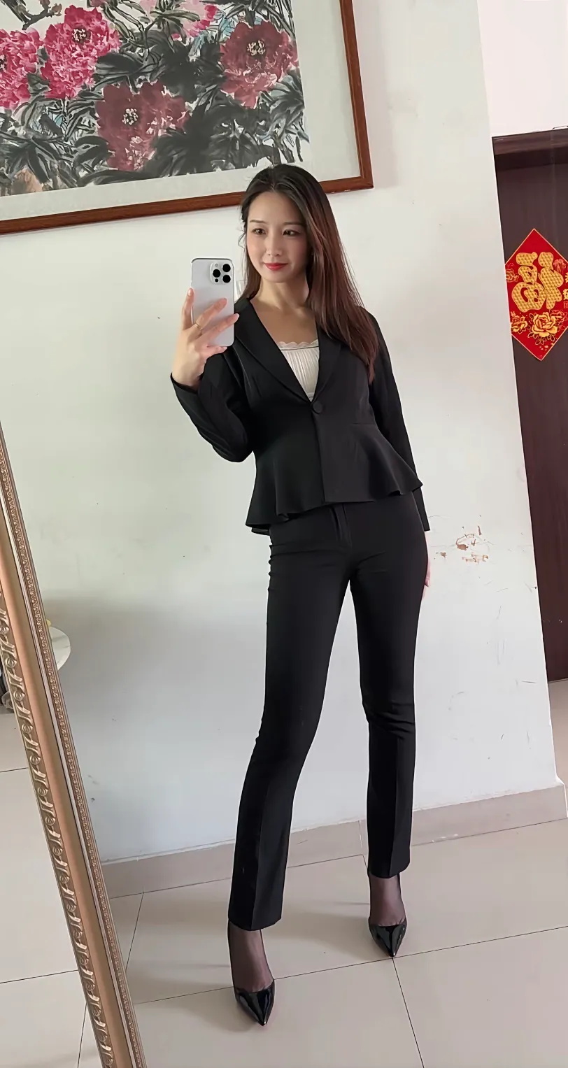 黑色荷叶边下摆西装套装,内搭白色上衣,配以黑色漆皮高跟鞋。整体既具职场干练,又不失柔和精致,属于优雅摩登的通勤风。