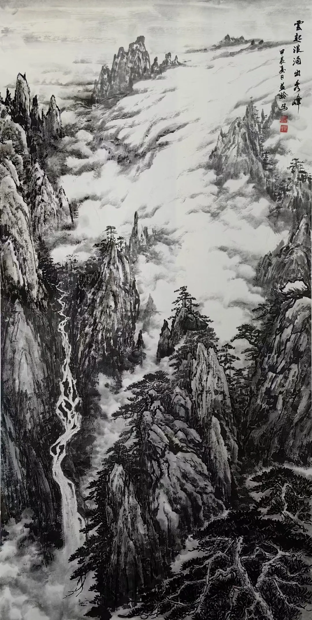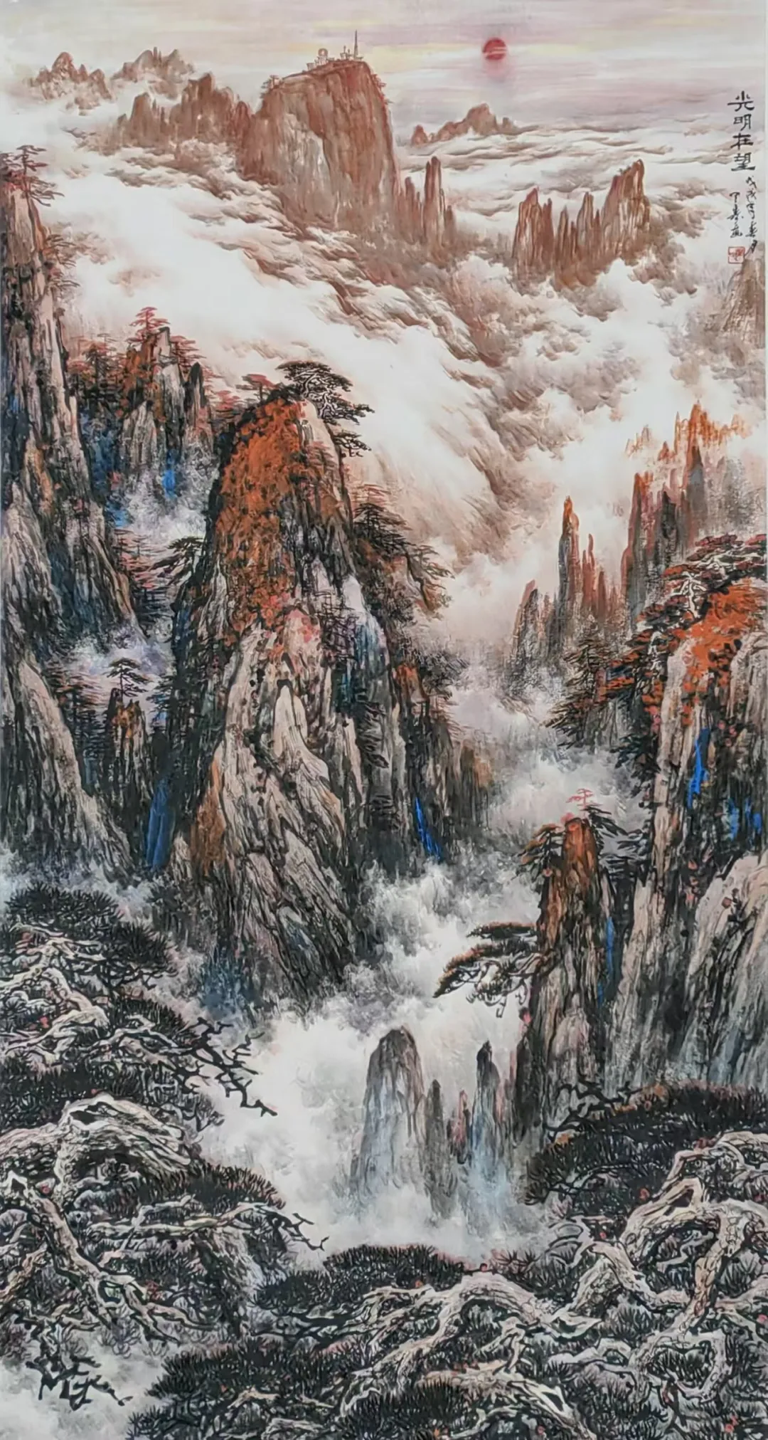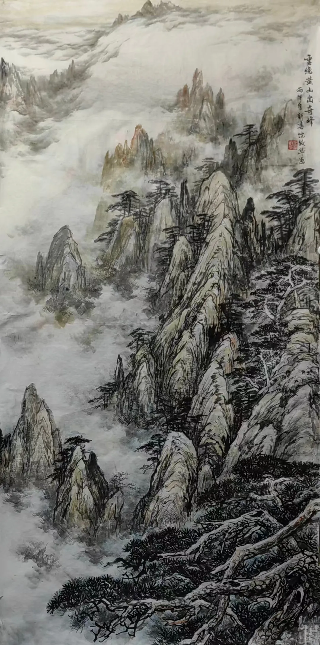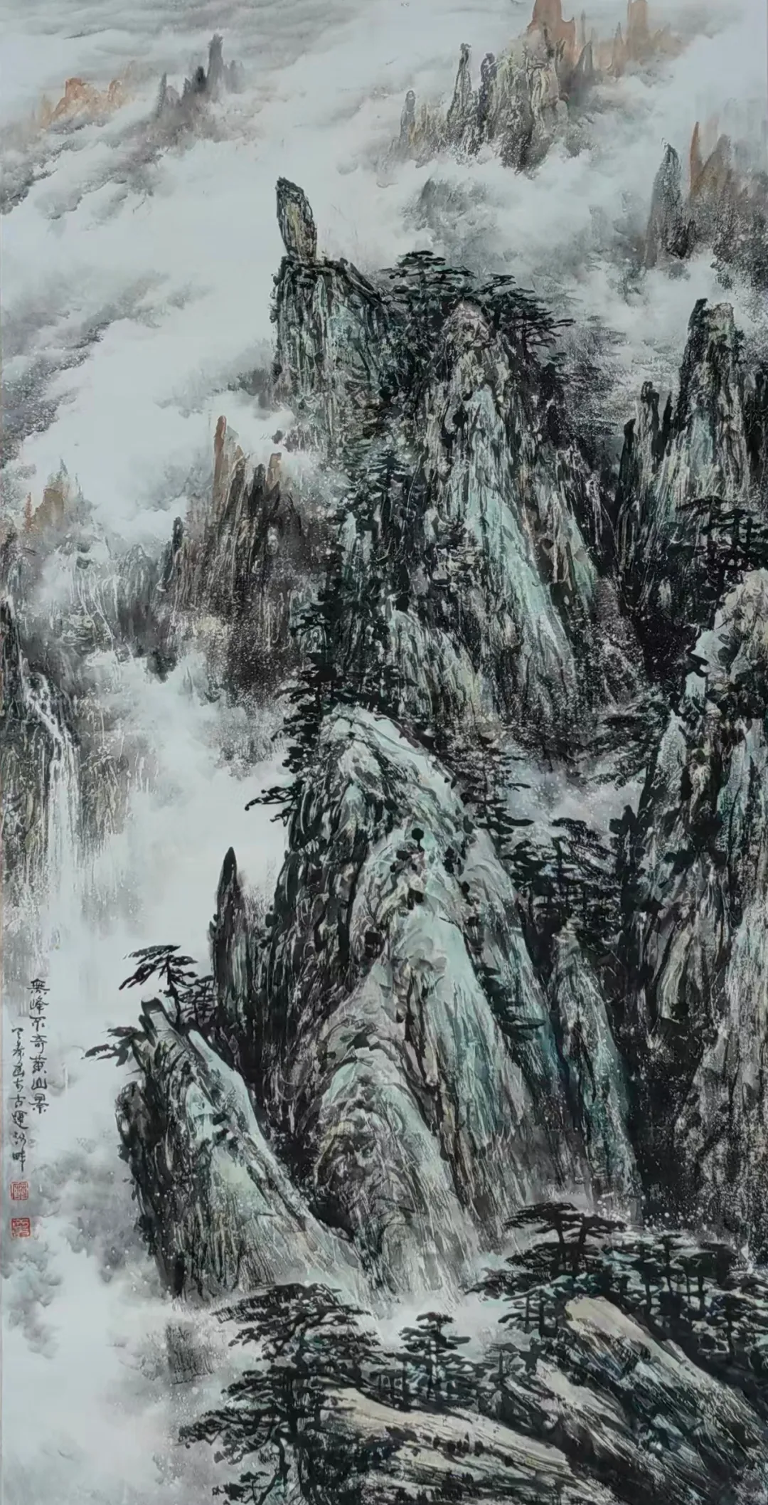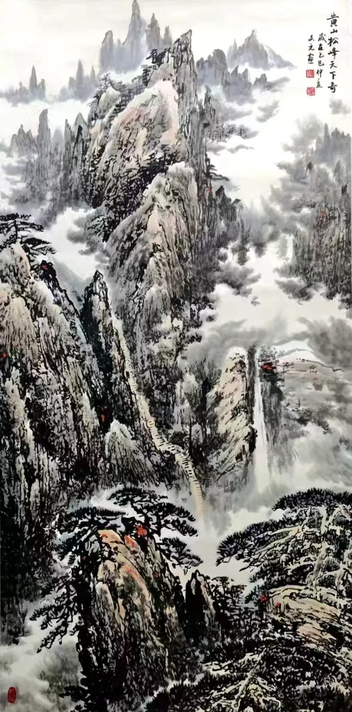 糜天寿先生自幼师从无锡画坛宗师秦古柳先生,深得传统笔墨精髓,又与钱绍武、董欣宾等艺坛名家同门砥砺,于清华美院“刘有成黄山山水画高研班”结业,博采众长。数十年来,他潜心绘事,尤以倾情黄山闻名。先生笔下的黄山,不仅是奇松、怪石、云海、冬雪的自然写照,更是其吸纳宋元以来传统皴法之养分,融汇个人体悟而凝练成的“糜家皴”之艺术呈现。其构图融散点与焦点于一体,画面层峦叠嶂,云烟浮动,既具高远深邃之空间意境,又富“看山是山,看水是水”至“看山还是山,看水还是水”的哲学思辨。线条刚柔相济,墨韵酣畅淋漓,于勾勒皴擦间,黄山之魂、云海之韵、松石之骨、自然之声,仿佛跃然纸上,令观者如临其境,心驰神往。