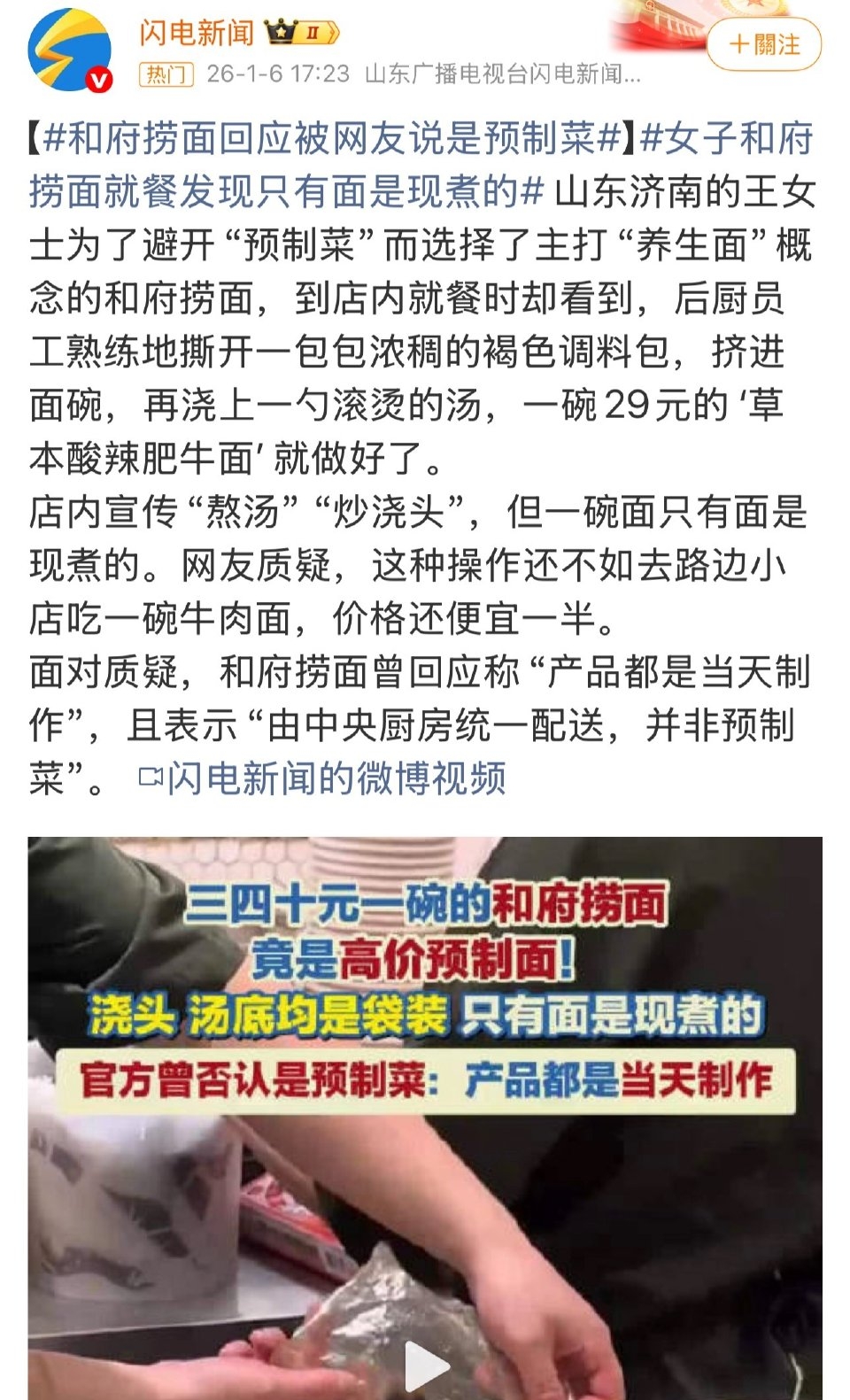 当消费者为避开预制菜而选择一家宣称“熬汤”“炒浇头”的养生面馆,却亲眼目睹后厨撕开浓稠调料包时,我们究竟在为什么样的“现做”买单?近日,和府捞面被指“只有面是现煮”的事件,不仅引发对品牌宣传的质疑,更掀起了餐饮行业“什么是真正现制”的深层讨论。